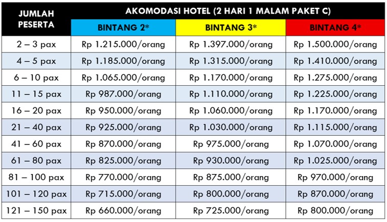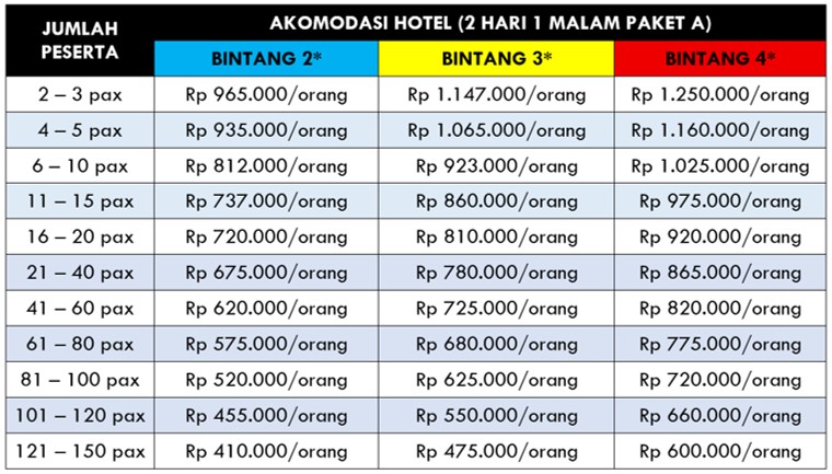 Harga untuk semua paket tour di atas adalah harga /orang dengan minimum peserta adalah 2 orang. Bayi umur kurang dari 3 tahun free, 3-5 tahun 50%, 6-7 tahun 75%, 8 tahun 100%