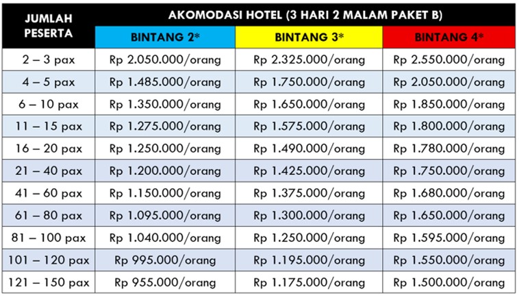 Harga untuk semua paket tour di atas adalah harga /orang dengan minimum peserta adalah 2 orang. Bayi umur kurang dari 3 tahun free, 3-5 tahun 50%, 6-7 tahun 75%, 8 tahun 100%